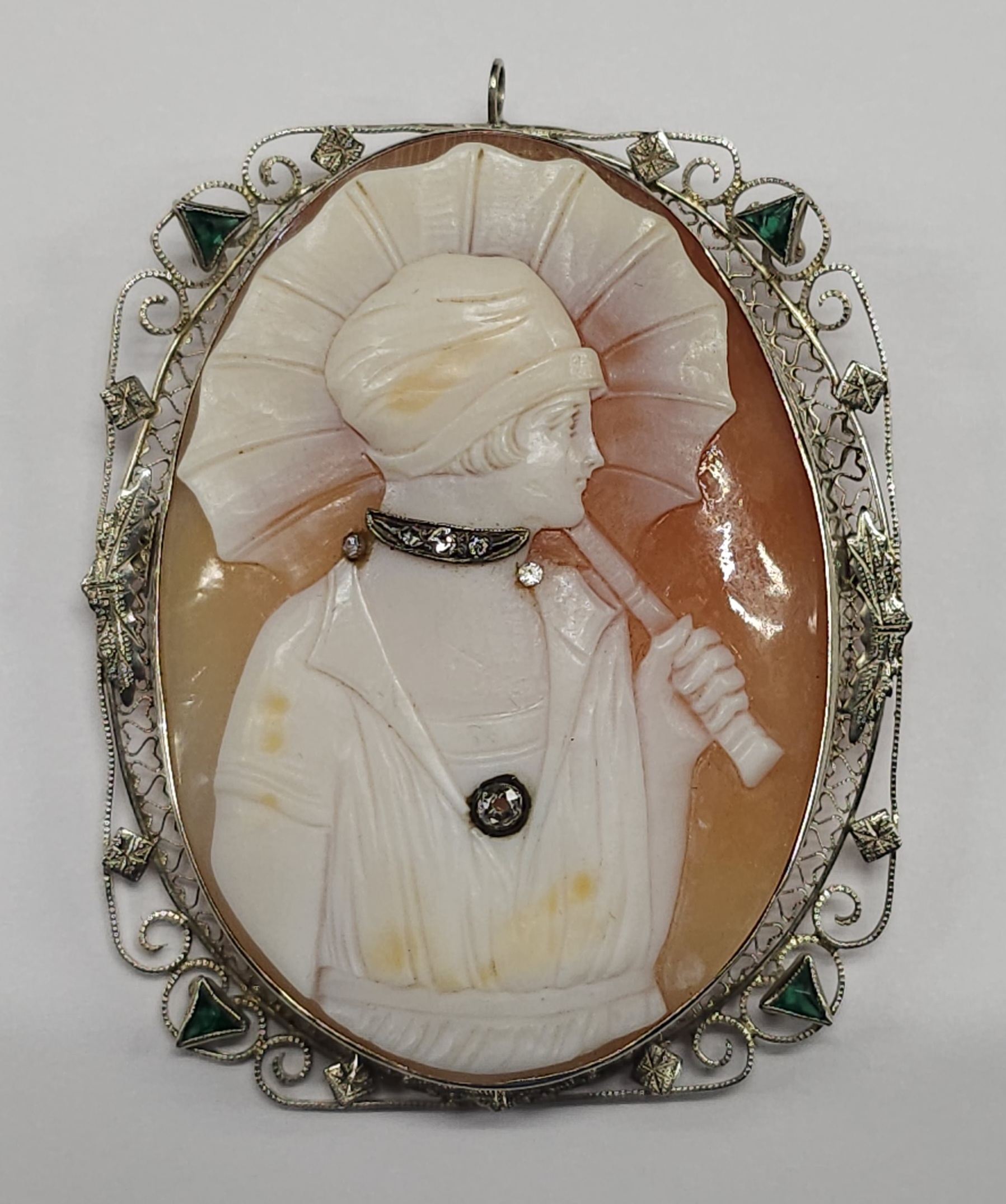 Stunning 1860-70s 14KT Gold Jeweled Shell Carved Cameo Brooch of a Victorian lady with jeweled choker necklace, and a diamond embedded Brooch into the shell. Also has emeralds in the silver frame. Collector grade example and is from the Pamela Campbell collection. Total weight 22 grams. Size: 2 1/4″ x 1 7/8″