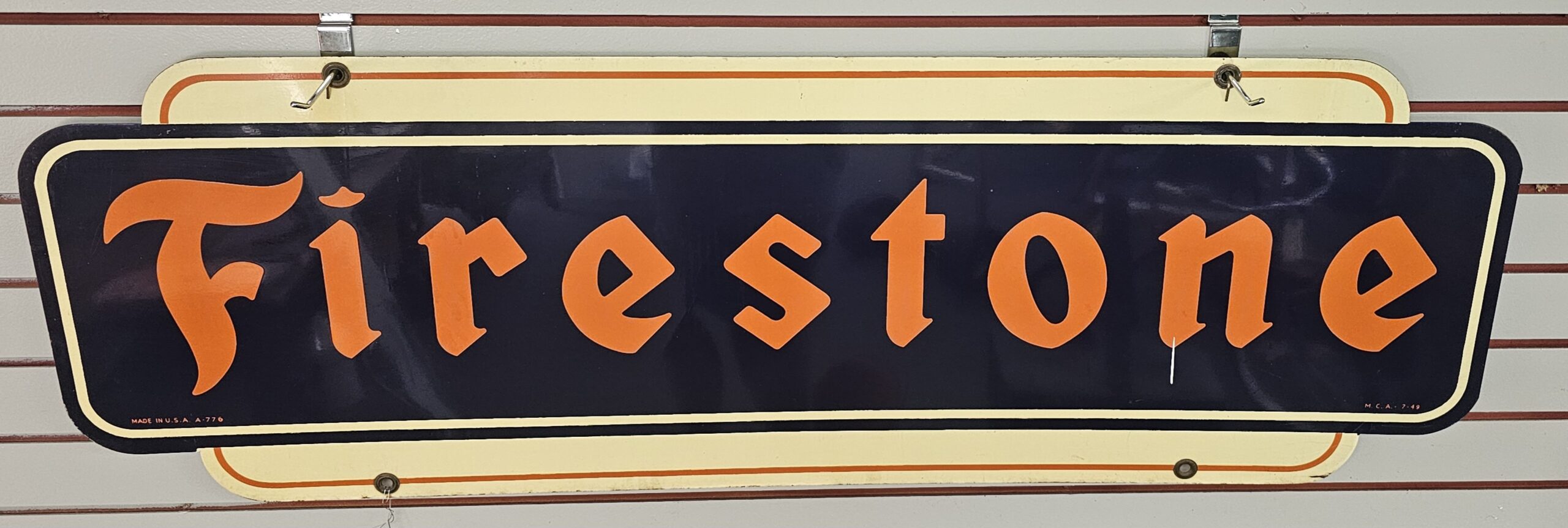 Authentic 1949 Porcelain Firestone Hanging Sign (DS) with original gloss and color. Made in USA A-776 – MCA 7-49 Size: 48″ x 16″