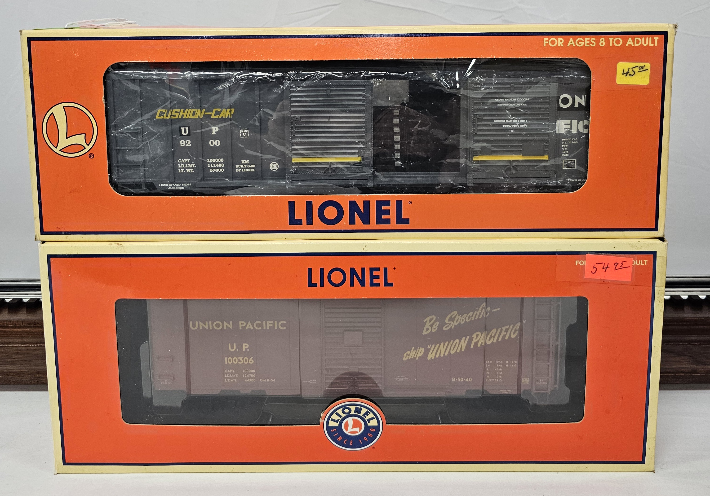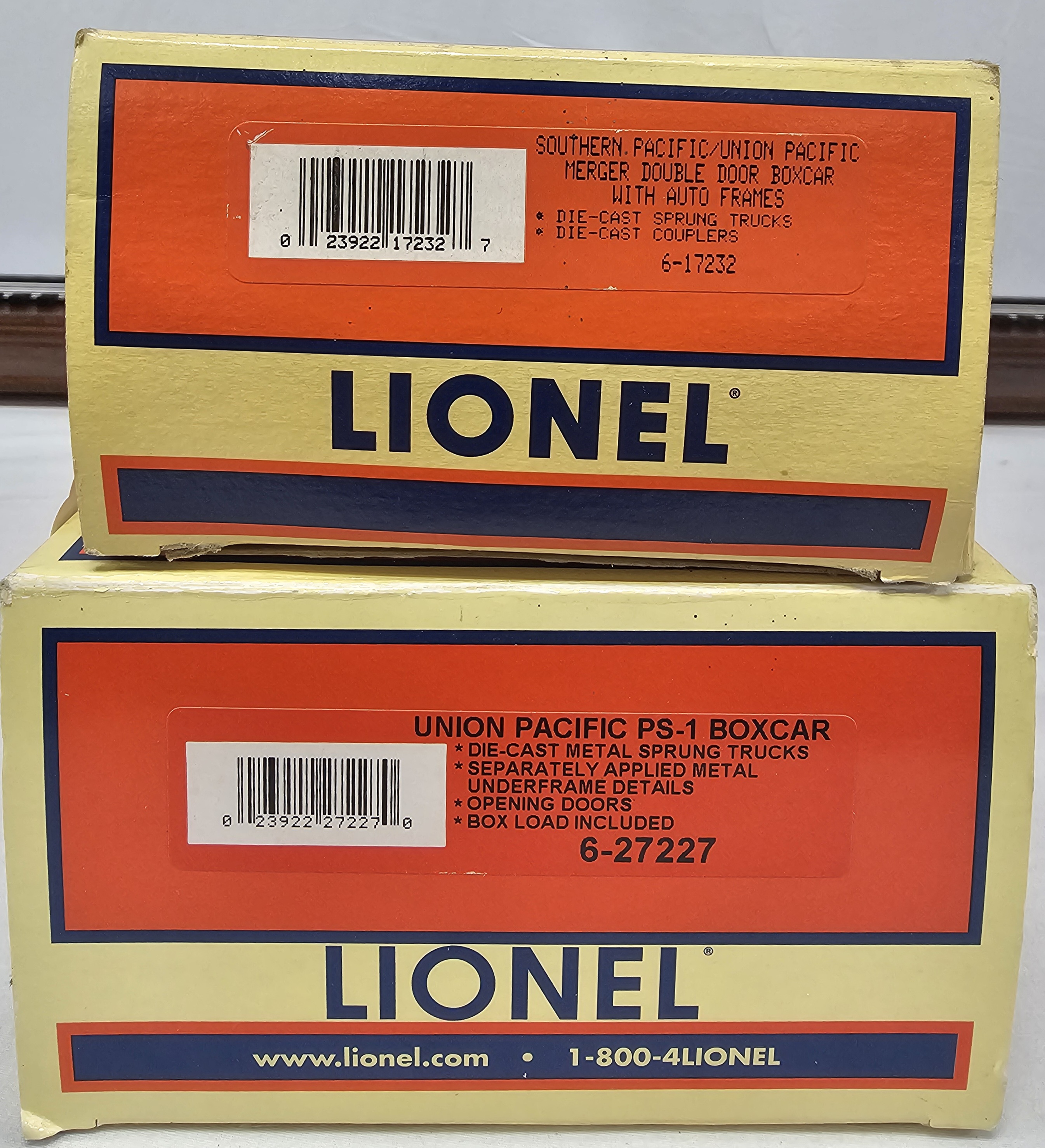 Lionel Boxcar Lot of Two Both C-8+. 1- Southern Pacific/Union Pacific Merger Double-Door Boxcar with Auto Frames 6-17232. 2- Union Pacific PS-1 Boxcar 6-17232.