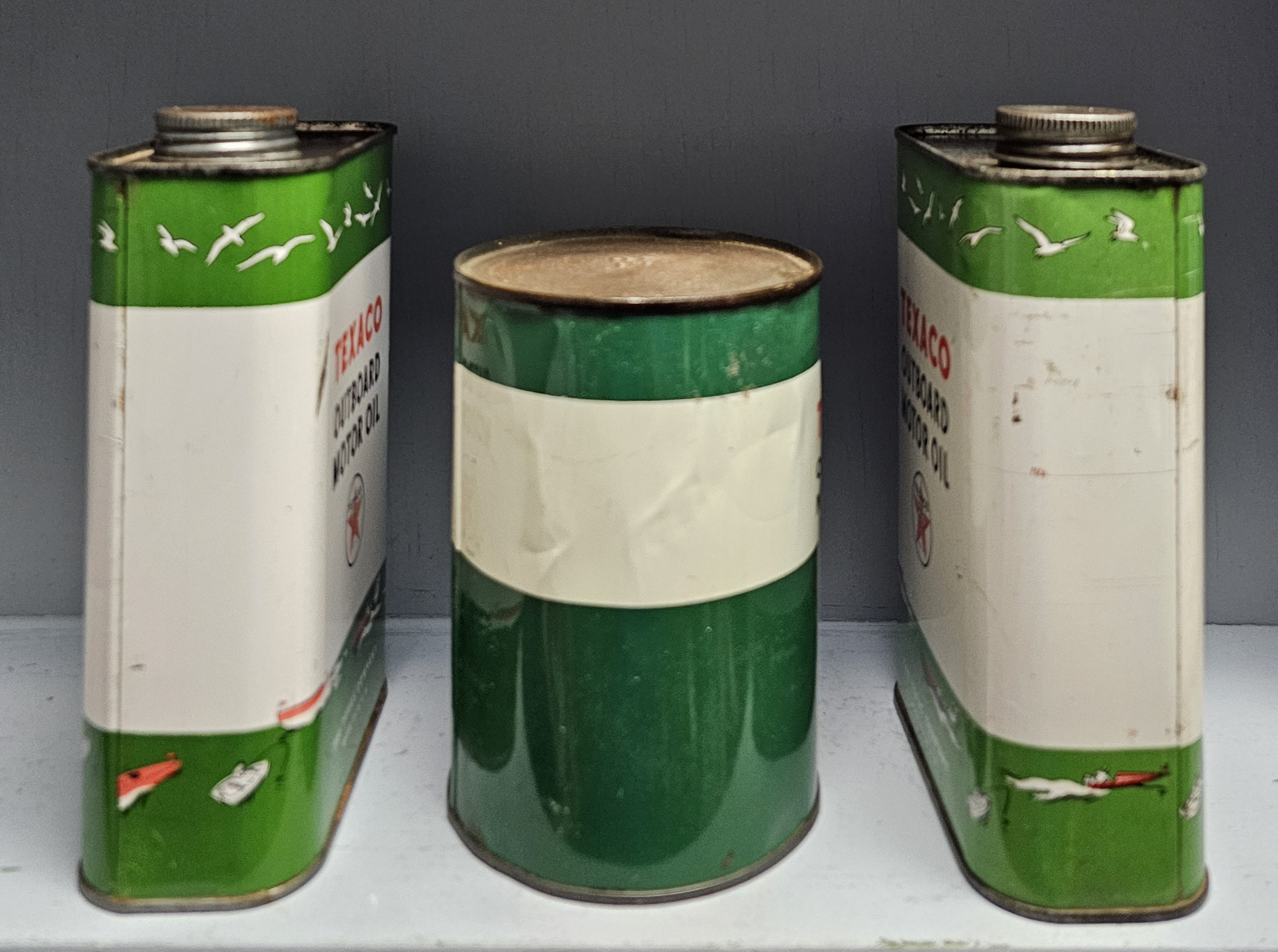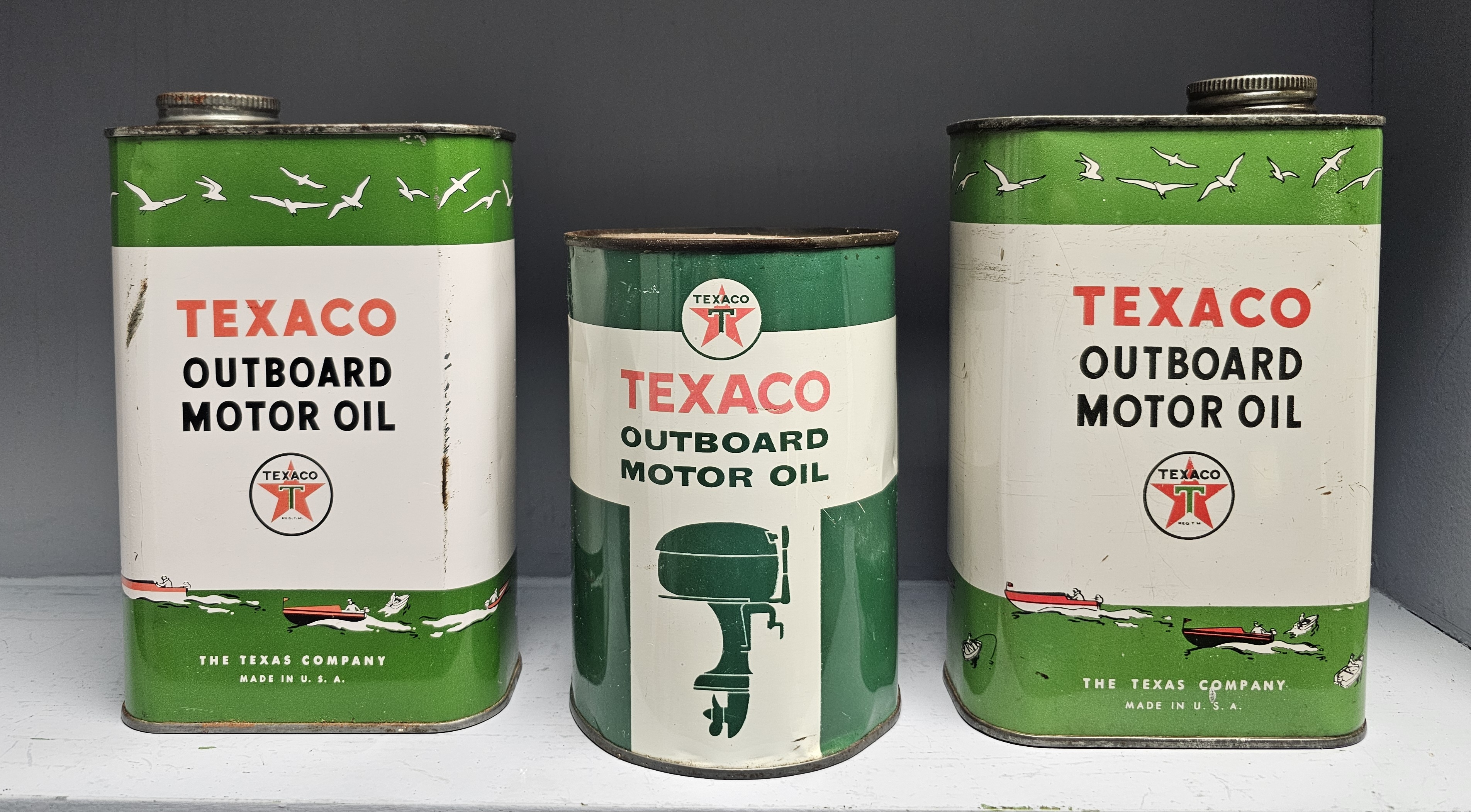 Rare 1940’s Texaco Marine Outboard Motor Oil Can Lot of 3, all three cans are in VG condition with two having a full can of oil. Rare to find these in this condition.