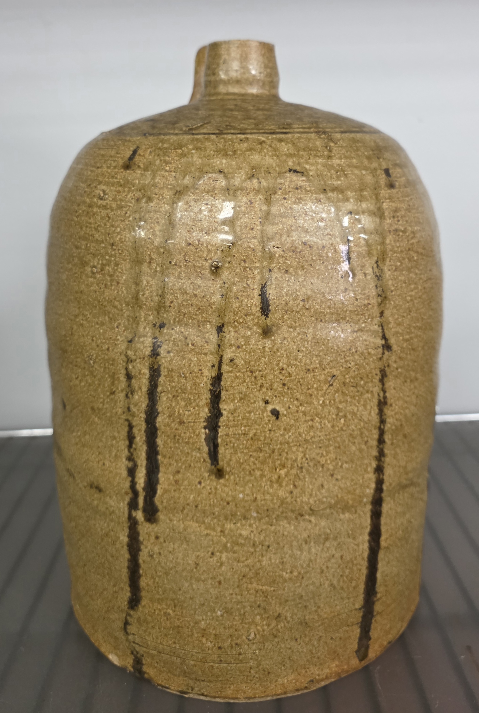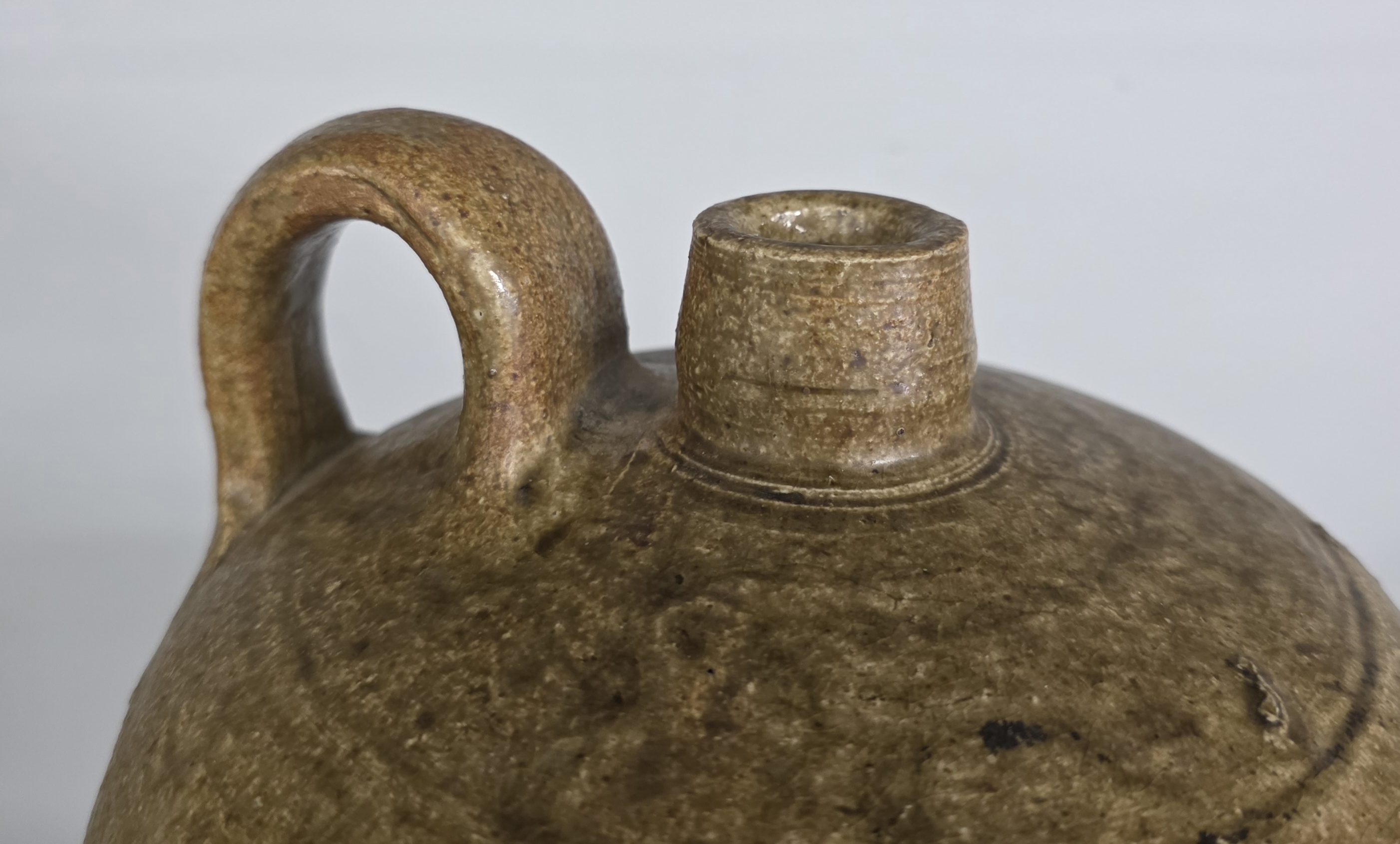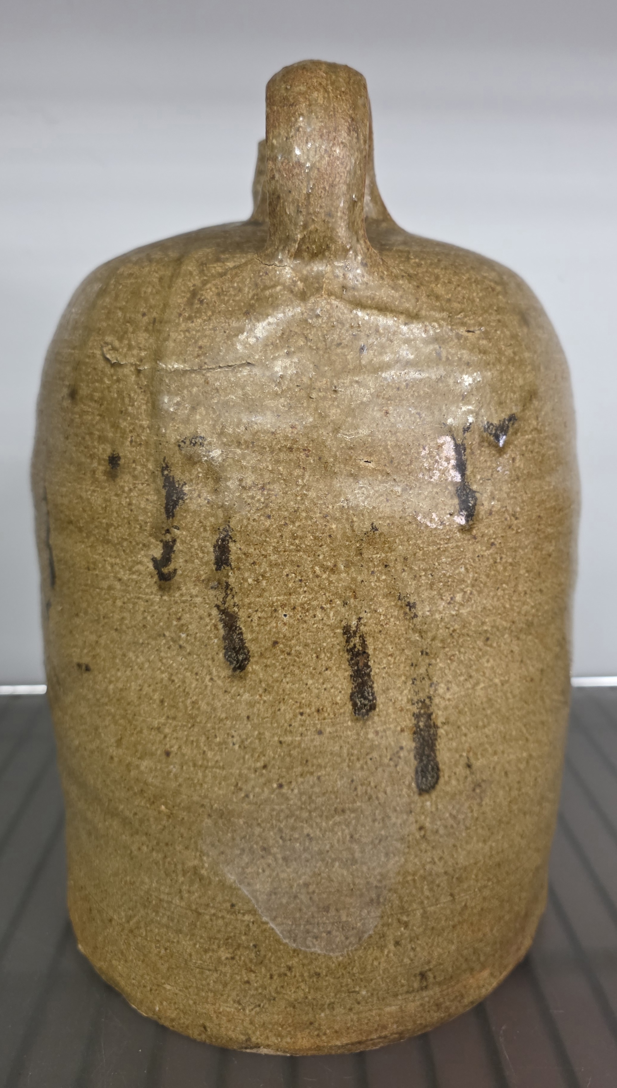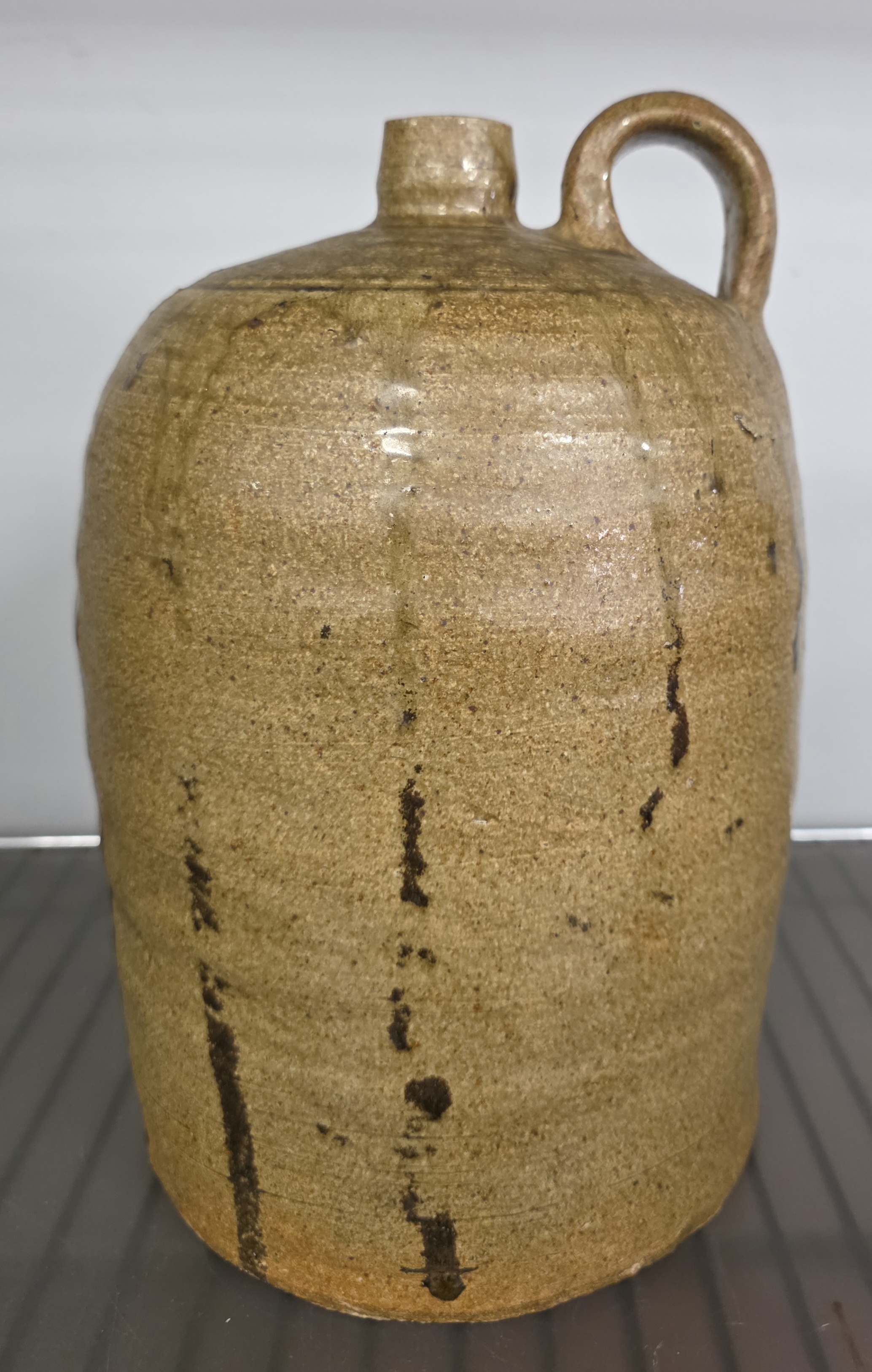 Outstanding 1850s Edgefield South Carolina BF Landrum Two Gallon Jug with a modified lime alkaline glaze and strong attribution of BF Landrum shop, slave made example. Great form and strong eye appeal and also in collector grade example with no damage and no repairs. Standing: 11″ Tall