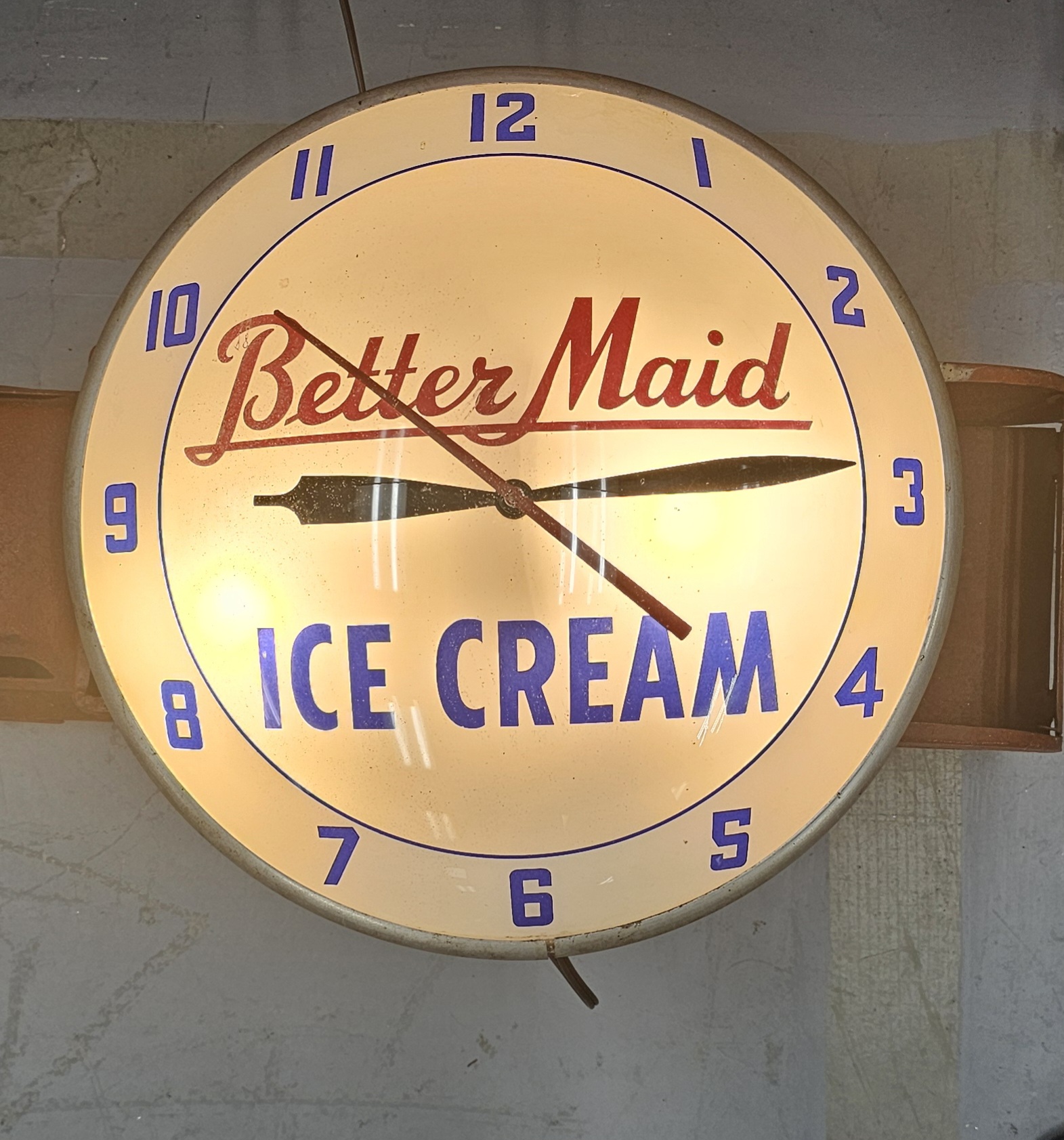1950-60s Athens Georgia, Better Maid Ice Cream Double Bubble Light Up Clock. In great working order. We do not guarantee clock parts when shipped.