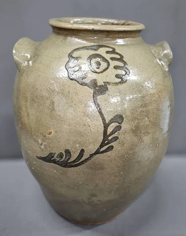 Outstanding Thomas Chandler Edgefield SC Broken Stem Jar circa early 1850s Kirksey Crossroads Edgefield SC district. This jar has graceful form and one of the best iron slip tailing decorations that I have seen on a Chandler Broken Stem jar. The detail in the iron slip decoration is very vivid and complete. This is one of his significant examples. Although unsigned, there is no doubt that this is of the hands of the Chandler Maker shop. Slave decorated. When it comes to condition, this jar is outstanding condition. There are no hairlines. Minor edge flaking on the left lug handle that is done to museum specifications. The right lug lifter handle has the same restoration but retains the original integrity of the lug handle. Also noted 2 finger prints inside jar probably of the hands of a female due to how small they are. Other than that, there are no other issues. Standing 14″ T